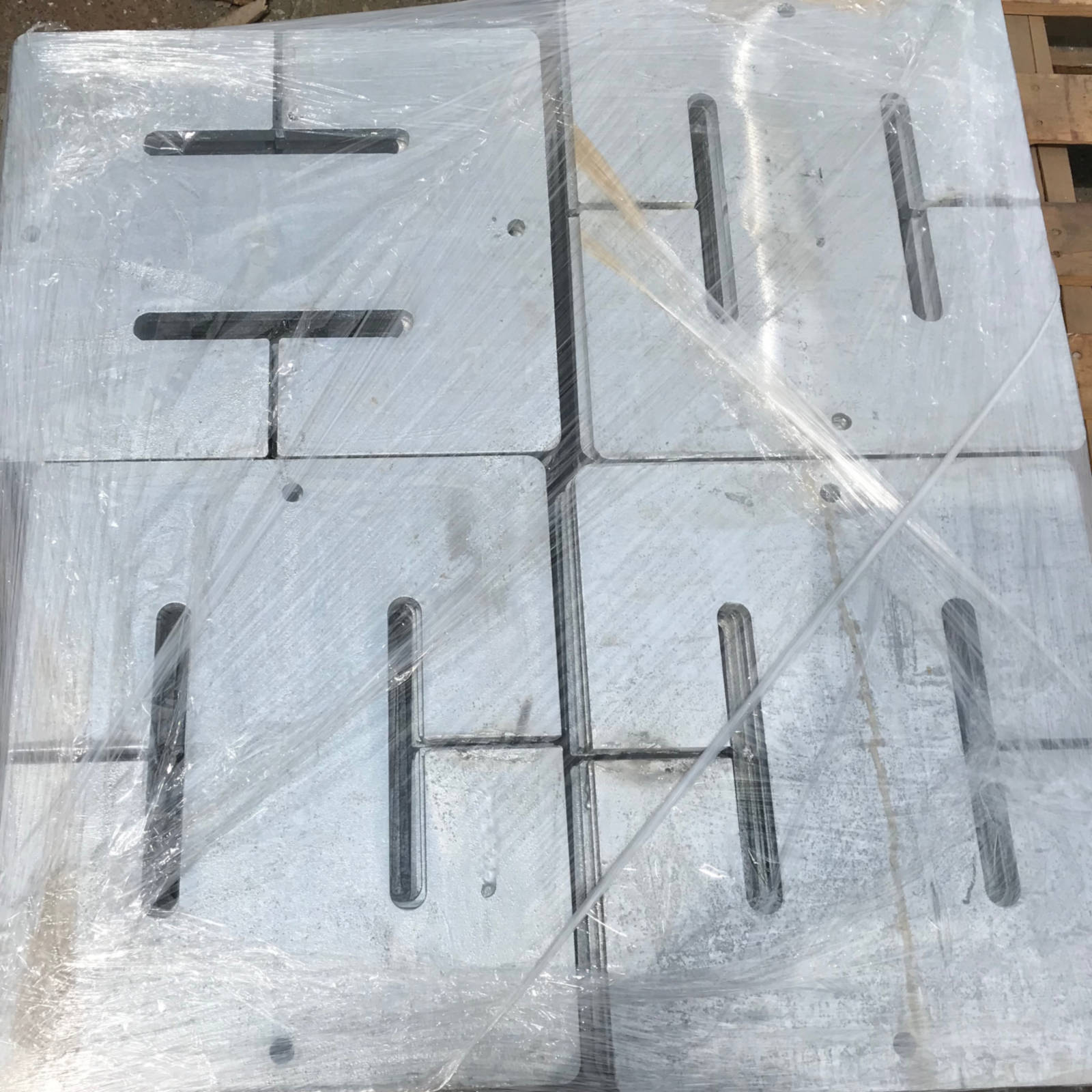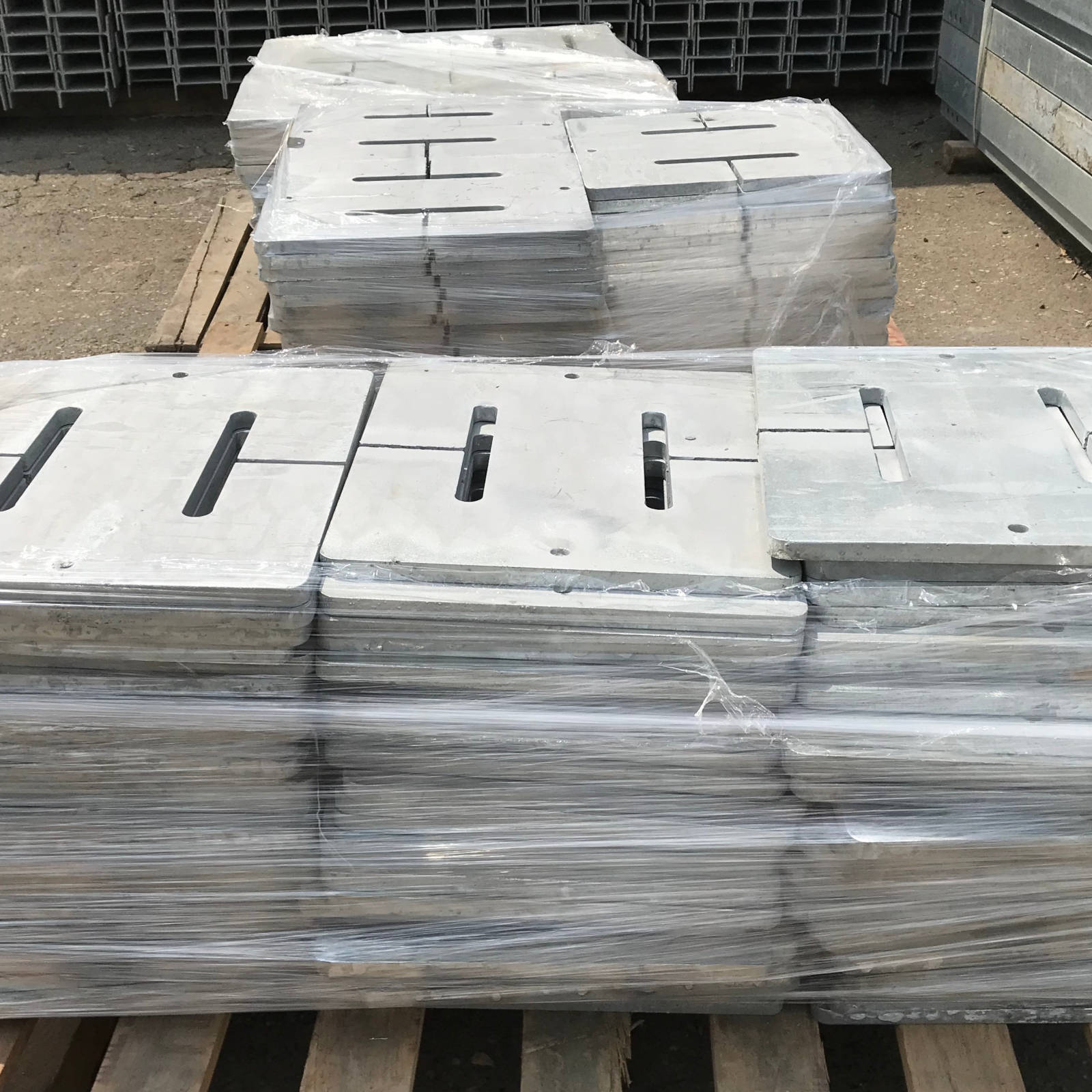 Each of the counterweights shown here weighs about 36 lbs. Multiple counterweights are used on each gate depending on its length, with longer gates requiring more weight. Some gates need up to 16 counterweights (576 lbs) to operate properly.